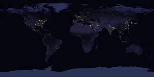 The image shows the outline of Earth glowing in light blue and the city lights of Europe and northern Africa shining bright.